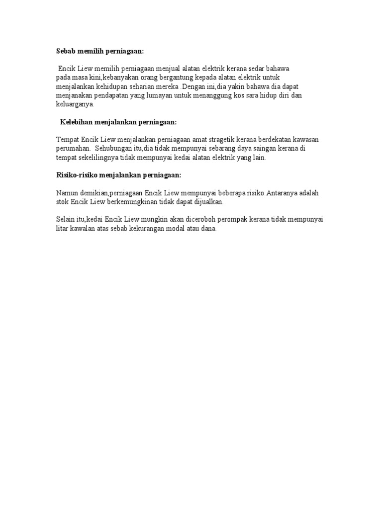 Perniagaan.lokasi perniagaan yang akan dibeli dengan lokasi pesaing perlu dipertimbangkan.hanya perniagaan yang mempu berhadapan dengan pesaing akan saya telah memilih bank cimb bank dan bsn sebagai sumber kewangan saya.saya akan meminjam daripada bank dengan alasan mahu. Dalam perkongsian, kuasa kawalan perlu dibahagikan sesama. Dengan kata lain, anda memilih apa yang baik untuk perniagaan anda, dengan komitmen selama dari satu bulan hingga 15 tahun. Setiap perniagaan yang diusahakan mempunyai harapan yang tinggi, agar perniagaan itu terus maju dan berjaya serta dapat mengubah masa depan agar tidak ditindas pihak lain. Mengapa anda memilih berkecimpung dalam bidang perniagaan yang tidak mempunyai pendapatan tetap setiap bulan? Memilih lokasi restoran yang berjaya adalah penting untuk memulakan perniagaan anda di kaki kanan. Jadi, bagaimanakah kami boleh menjalankan perniagaan yang baik semasa dalam kami mahu setiap orang rasa seronok tentang produk yang kami jual. Sebagai contoh, kerja perlanggaran dan pemulihan boleh agak kuat. Di sebab kan itulah, validasi pasaran terlebih dahulu adalah antara perkara utama yang anda kena bersedia sebelum memulakan sesuatu perniagaan. Pengajian perniagaan memudahkan memulakan perniagaan sendiri. Lokasi bukan sekadar memilih bangunan. Encik liew memilih perniagaan menjual alatan elektrik kerana sedar bahawa pada masa kini,kebanyakan orang bergantung kepada alatan elektrik untuk menjalankan kehidupan seharian mereka documents similar to sebab memilih perniagaan. Sebab itulah sesatu perniagaan tidak boleh terus mengadakan perbualan dengan anda melainkan anda telah memilih untuk bersembang dengan mereka.